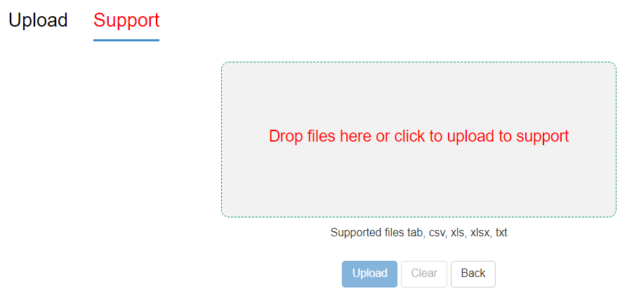 - The Upload page will open. Select the Support tab.